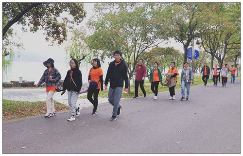 來到東錢湖,柳枝搖曳、鮮花盛開、碧波蕩漾,令人心曠神怡。陳志勇董事長作動員發(fā)言,“現(xiàn)在,我們出發(fā)!”一聲響亮的號令,徒步活動正式開始。從小普陀景區(qū)到圓融廣場經(jīng)黃家岙到下水濕地公園,全程大約6公里,一支身著橙色衣服的隊伍行走于山水之間,充滿活力與朝氣,形成一道流動的風(fēng)景線。