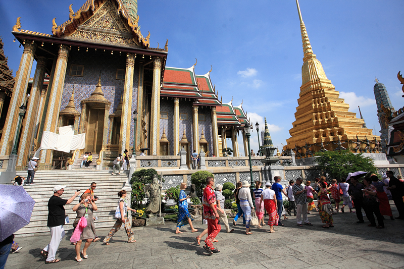 來到曼谷就不得不去大皇宮,這里是曼谷王朝拉瑪一世到拉瑪八世居住的地方,這里匯聚了泰國建筑、繪畫、雕刻和裝潢藝術(shù)的精粹,其風格具有鮮明的暹羅建筑藝術(shù)特點,被譽為“泰國藝術(shù)大全”。在大皇宮北邊的位置上就是玉佛寺,泰國人民最崇敬的玉佛就供奉在佛寺大雄寶殿金色的高座上。玉佛由整塊翡翠雕琢而成,高66公分,依照雨季、涼季、熱季更換錦衣。更換錦衣儀式都由國王親自主持。大皇宮和玉佛寺合稱為曼谷的標志,人們無不為眼前氣勢如虹、金光燦燦的建筑所震撼,其西式的建筑風格融合了泰國特色,仿佛在訴說著成長軌跡,是對歷史的記錄和對文化的傳承。